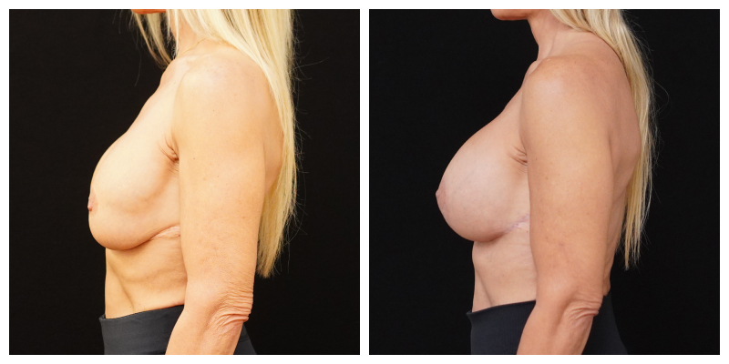 Esta mujer de 51 años se había colocado implantes mamarios con otro cirujano. No estaba conforme con la forma de sus senos y se sometió a la extracción de los implantes con un levantamiento de senos (imagen 6 meses después).