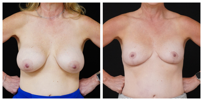 Esta mujer de 68 años no estaba conforme con la forma de sus senos luego de un aumento de senos realizado por otro cirujano. Se quitó los implantes con un levantamiento de senos (que se muestra cinco meses después).
