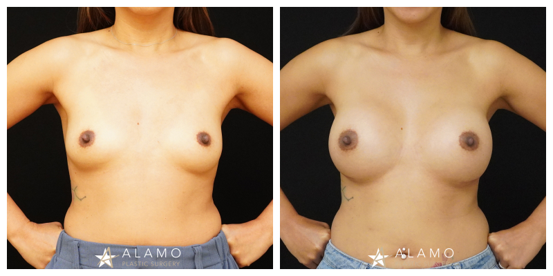 Esta mujer de 30 años quería aumentar el tamaño de sus senos y lograr un resultado natural. Se sometió a un aumento de senos con implantes Soft Touch de 295 cc a través de una incisión de doble plano en el pliegue mamario (imagen meses después).