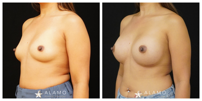Esta mujer de 25 años quería aumentar el tamaño de sus senos. Se sometió a un aumento de senos con implantes Soft Touch de 365 cc a través de una incisión de doble plano en el pliegue mamario (se muestra 5 meses después).