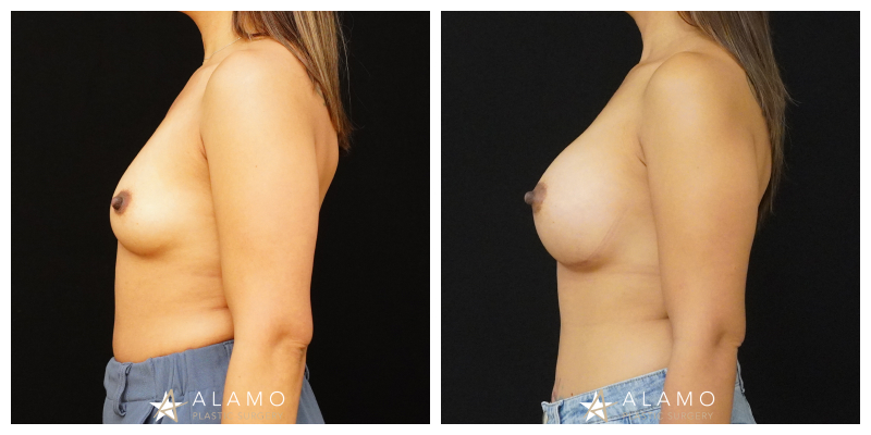 Esta mujer de 30 años quería cambiar la forma de sus senos después de tener hijos. Se sometió a un levantamiento mamario completo con implantes Soft Touch de 365 cc a través de una incisión de doble plano en el pliegue mamario (imagen 4 meses después).