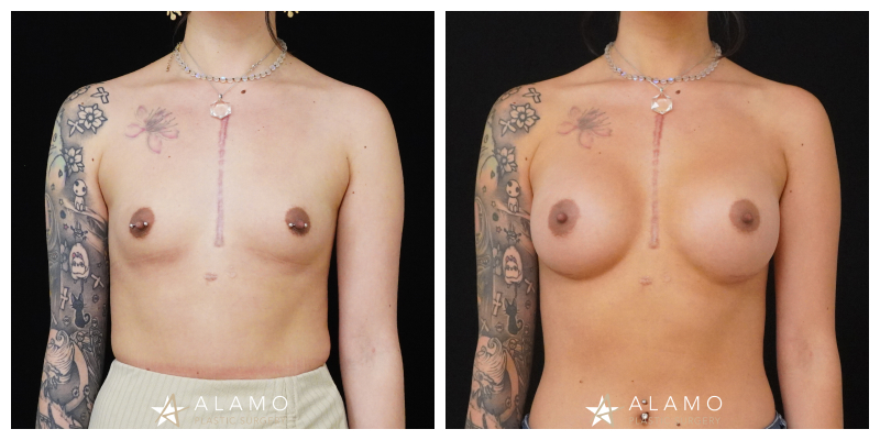 Esta mujer de 25 años quería aumentar el tamaño de sus pechos. Se sometió a un aumento de pecho con implantes Soft Touch de 480 cc a través de una incisión en el pliegue mamario de doble plano (se muestra 6 meses después).