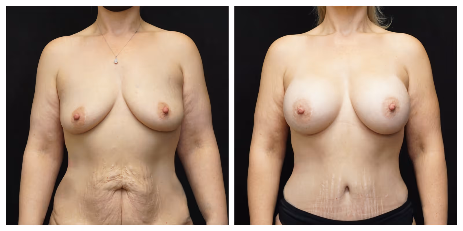 This 44-year-old female wanted to restore her body after children. She underwent full abdominoplasty, muscle repair, and breast augmentation (shown 6 months out).