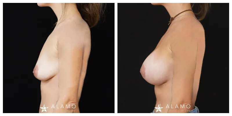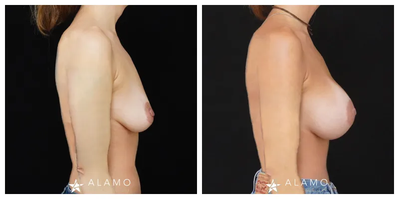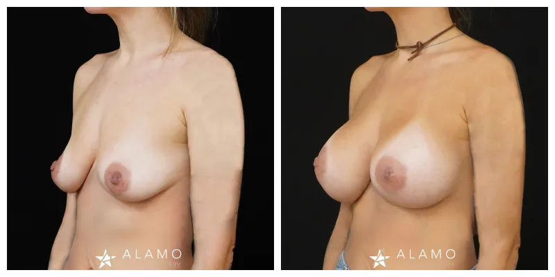 This 36-year-old female was unhappy with her breast shape and wanted to add volume to her breasts. She underwent a breast augmentation with breast lift with 445 cc Soft Touch implants through a dual plane breast fold incision (shown 4.5 months out).