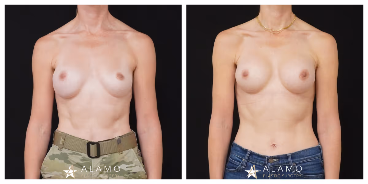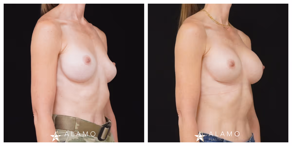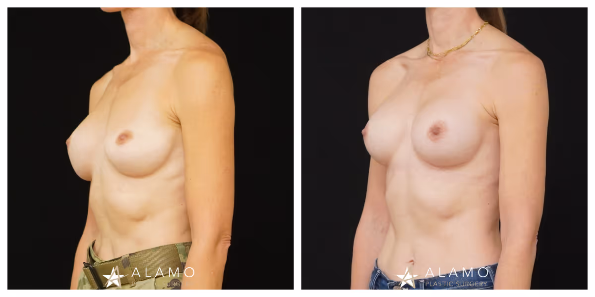 This 40-year-old female was unhappy with the breast asymmetry from implants (initial augmentation performed by another surgeon). She underwent breast implant revision with a 365 cc Soft Touch implants (shown 4.5 months out).