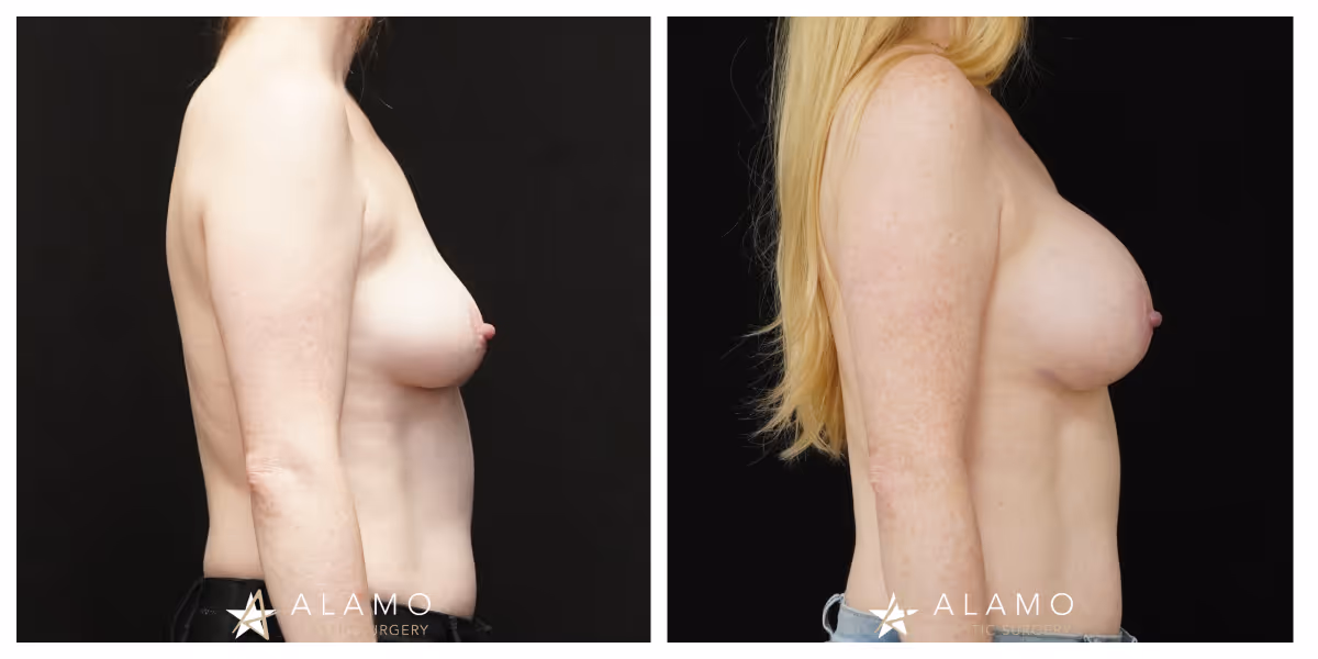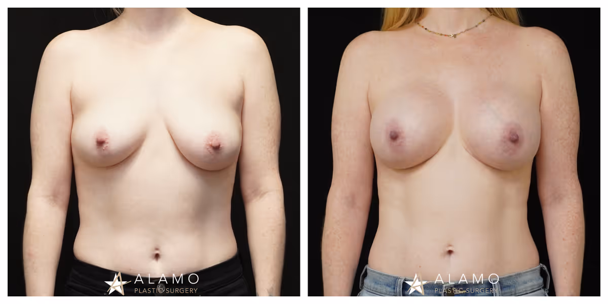 This 43-year-old female was unhappy with her breast shape and wanted to add volume to her breasts. She underwent a breast augmentation with breast lift with 365 cc Soft Touch implants through a dual plane breast fold incision (shown 5 months out).