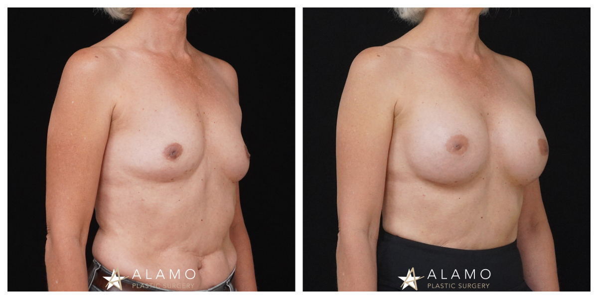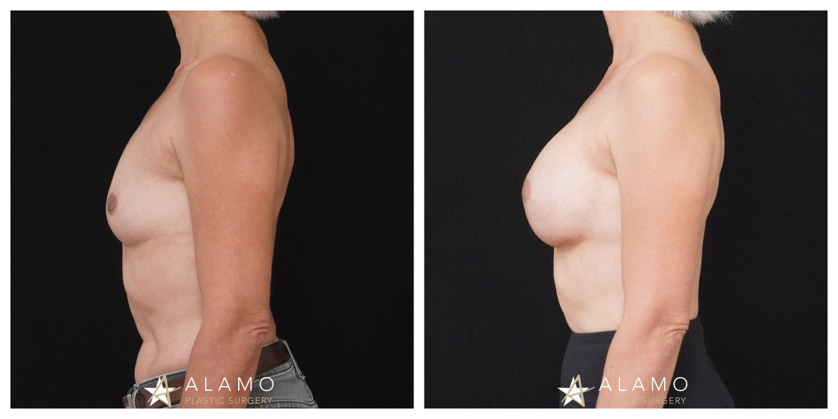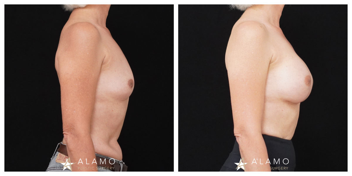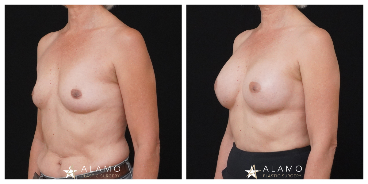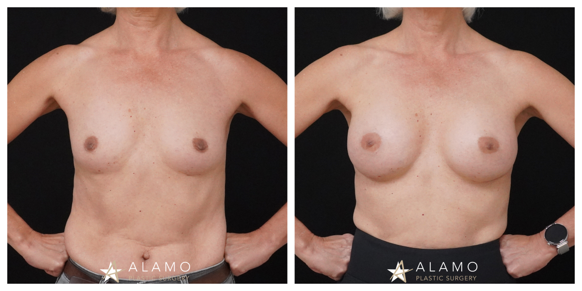 This 59-year-old female wanted to increase the size of her breasts and still have a natural result. She underwent breast augmentation using 295cc soft touch implants through a dual plane breast fold incision (shown 5 months out).