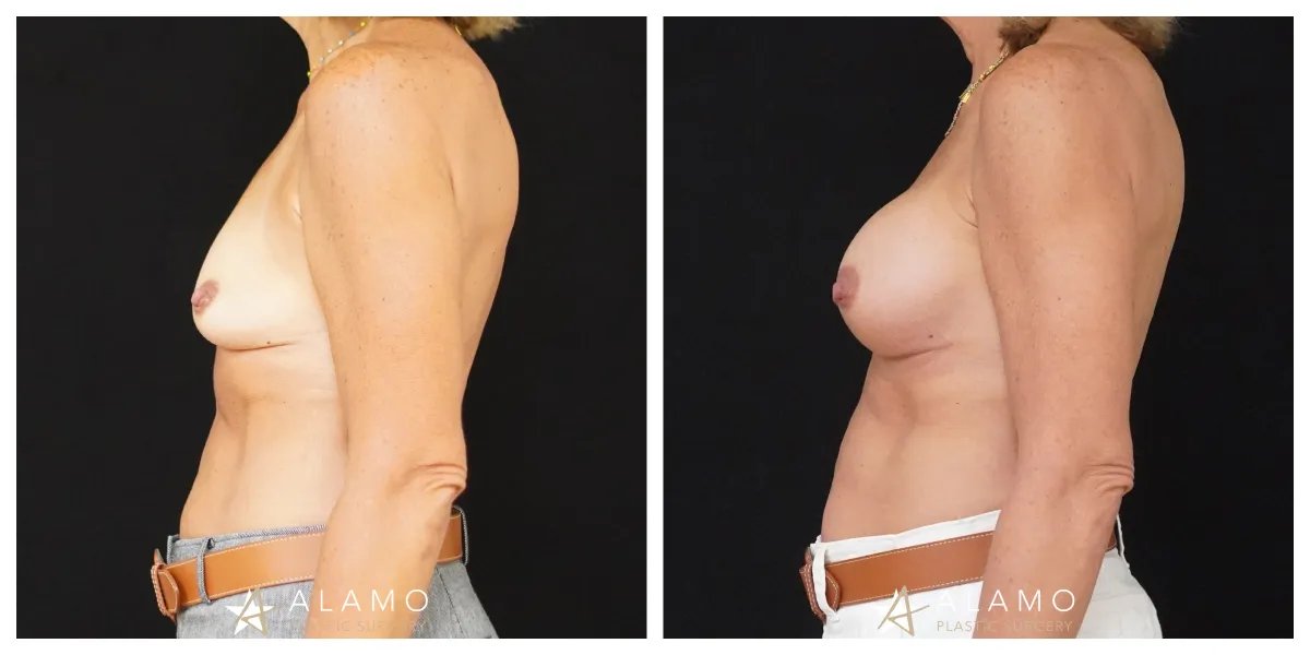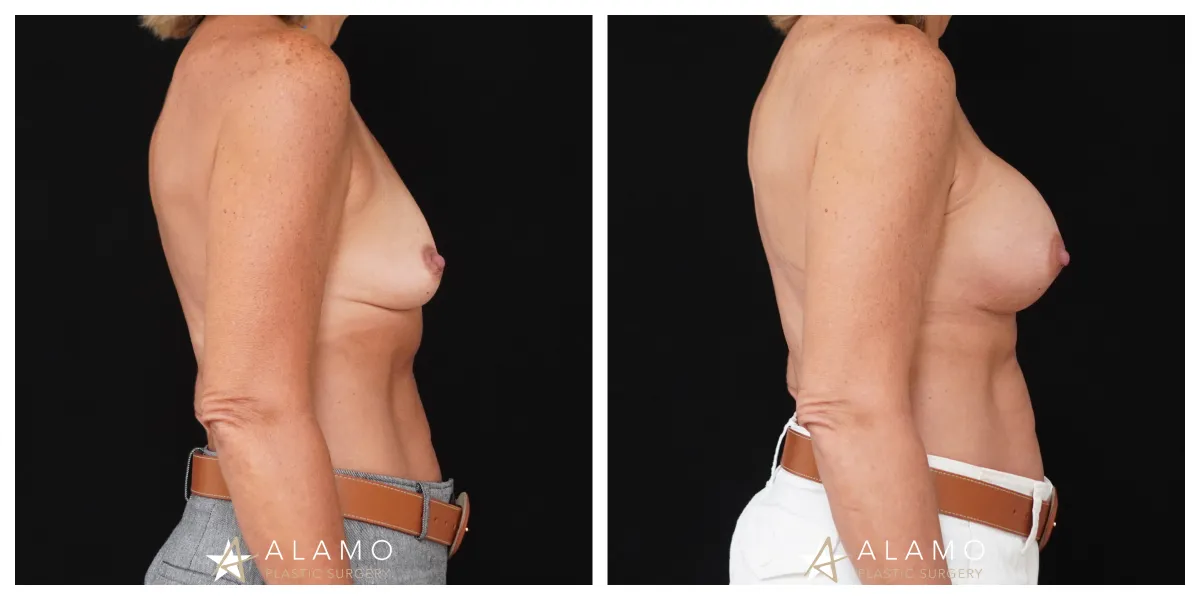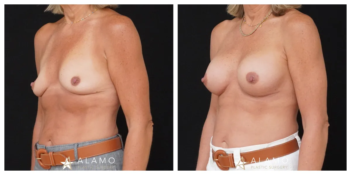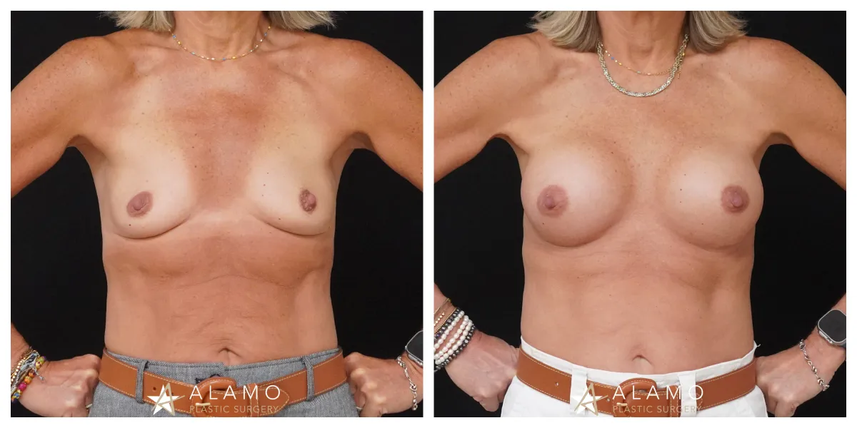 This 54-year-old female wanted to add volume to her breasts. She underwent a breast augmentation with 450 cc Soft Touch implants through a dual plane breast fold incision (shown 5 months out).